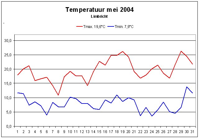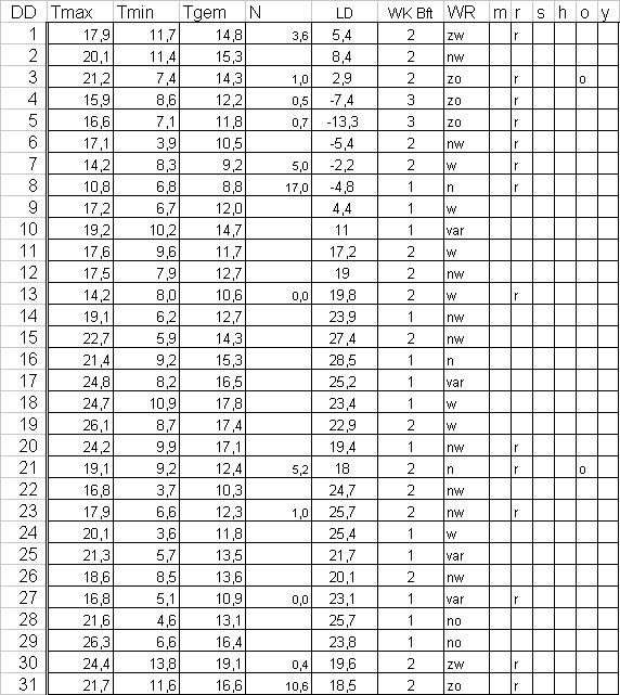 ( T = temperatuur in °C, N = neerslag in mm, LD = luchtdruk in hPa +1000 , WK = windkracht in Beaufort, WR = windrichting, m = mist, r = regen, s = sneeuw, h = hagel, o = onweer en y = ijzel ).