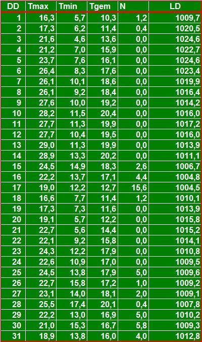 ( T = temperatuur in °C, N = neerslag in mm, LD = luchtdruk in hPa ).
