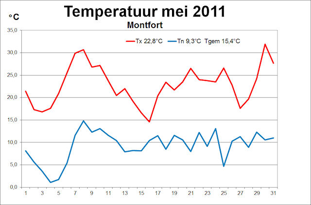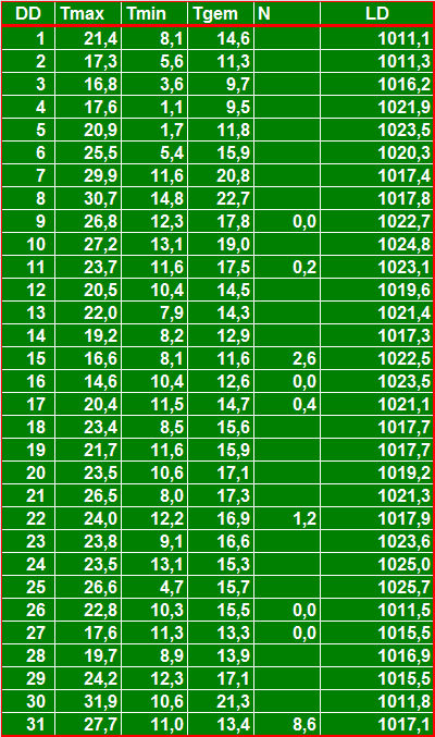 ( T = temperatuur in °C, N = neerslag in mm, LD = luchtdruk in hPa