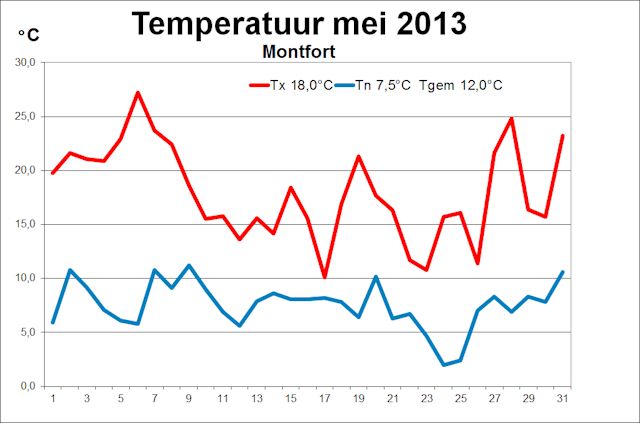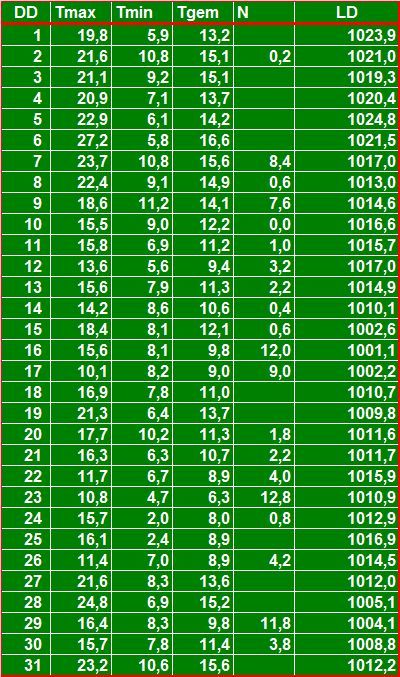 ( T = temperatuur in °C, N = neerslag in mm, LD = luchtdruk in hPa