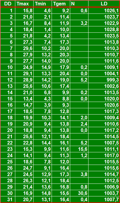 ( T = temperatuur in °C, N = neerslag in mm, LD = luchtdruk in hPa