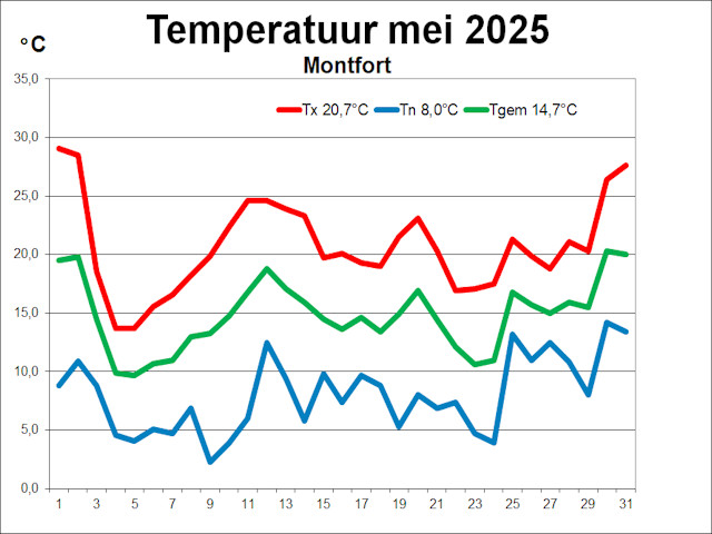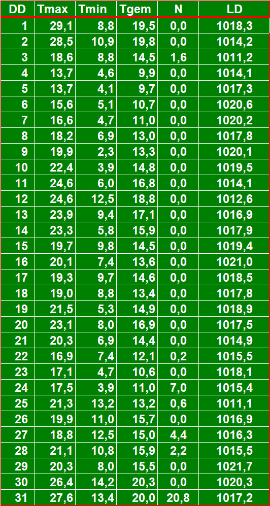 ( T = temperatuur in °C, N = neerslag in mm, LD = luchtdruk in hPa