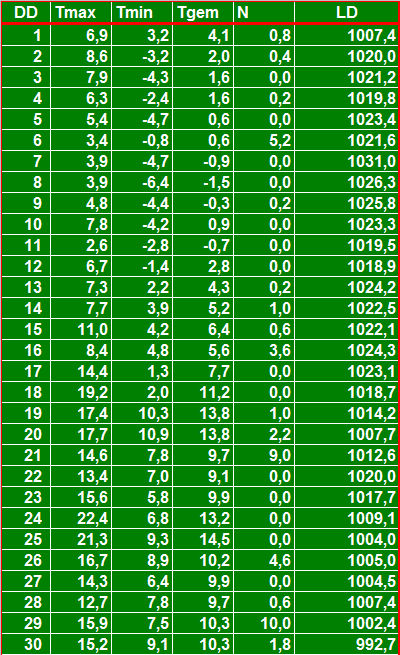 ( T = temperatuur in °C, N = neerslag in mm, LD = luchtdruk in hPa