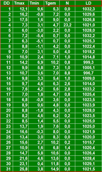 ( T = temperatuur in °C, N = neerslag in mm, LD = luchtdruk in hPa