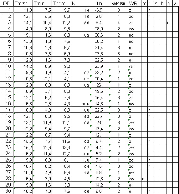 ( T = temperatuur in °C, N = neerslag in mm, LD = luchtdruk in hPa + 1000, WK = windkracht in Beaufort, WR = windrichting, m = mist, r = regen, s = sneeuw, h = hagel, o = onweer en y = ijzel ).