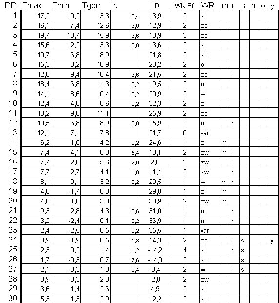 ( T = temperatuur in °C, N = neerslag in mm, LD = luchtdruk in hPa + 1000, WK = windkracht in Beaufort, WR = windrichting, m = mist, r = regen, s = sneeuw, h = hagel, o = onweer en y = ijzel ).