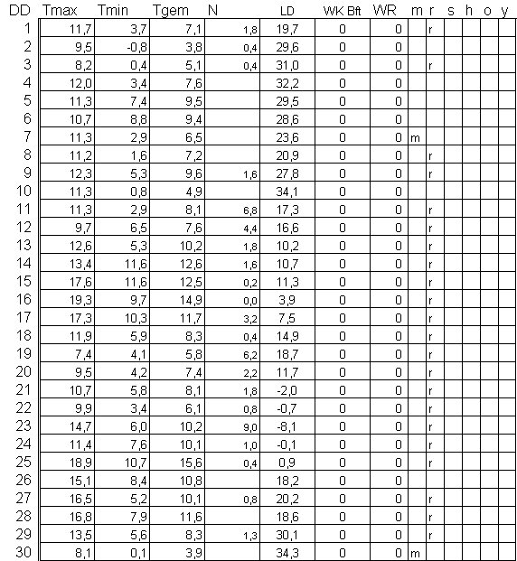 ( T = temperatuur in °C, N = neerslag in mm, LD = luchtdruk in hPa + 1000, WK = windkracht in Beaufort, WR = windrichting, m = mist, r = regen, s = sneeuw, h = hagel, o = onweer en y = ijzel ).