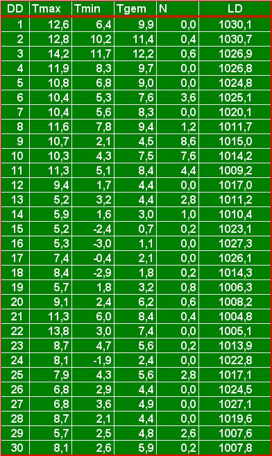 ( T = temperatuur in °C, N = neerslag in mm, LD = luchtdruk in hPa ).