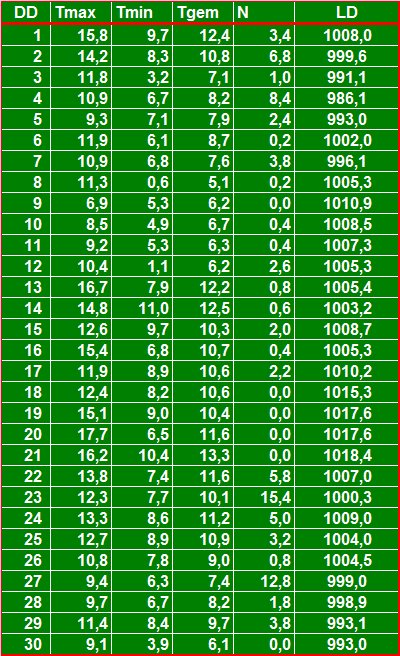 ( T = temperatuur in °C, N = neerslag in mm, LD = luchtdruk in hPa ).