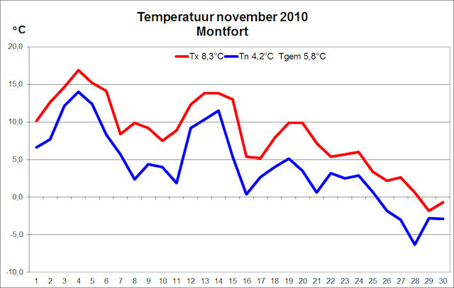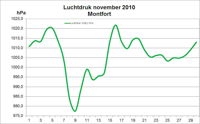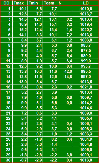 ( T = temperatuur in °C, N = neerslag in mm, LD = luchtdruk in hPa ).