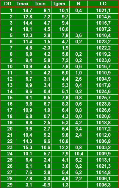 ( T = temperatuur in °C, N = neerslag in mm, LD = luchtdruk in hPa ).