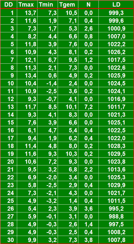 ( T = temperatuur in °C, N = neerslag in mm, LD = luchtdruk in hPa ).