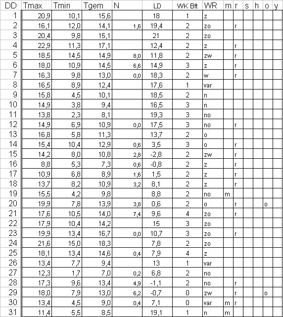 ( T = temperatuur in °C, N = neerslag in mm, LD = luchtdruk in hPa + 1000, WK = windkracht in Beaufort, WR = windrichting, m = mist, r = regen, s = sneeuw, h = hagel, o = onweer en y = ijzel ).