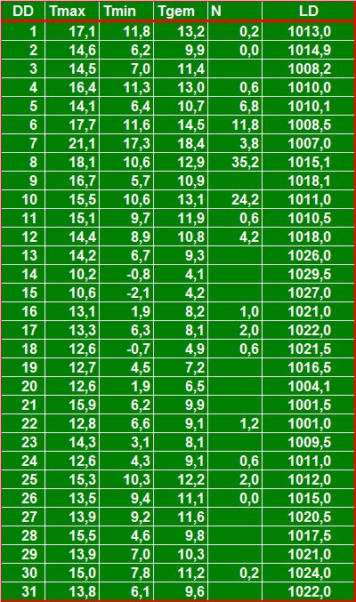 ( T = temperatuur in °C, N = neerslag in mm, LD = luchtdruk in hPa ).
