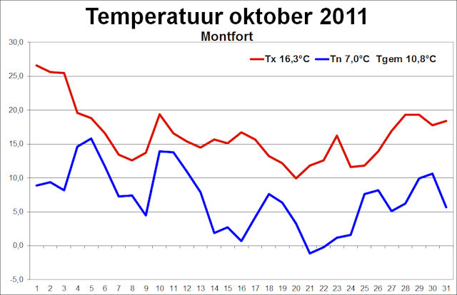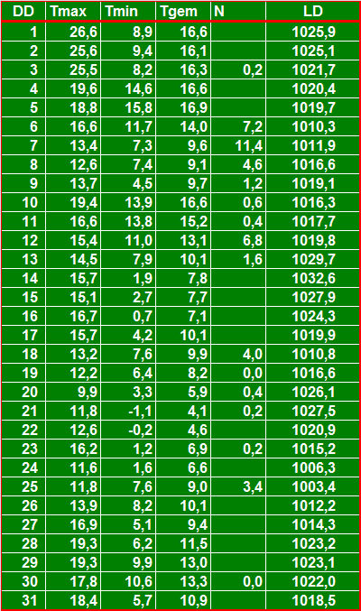 ( T = temperatuur in °C, N = neerslag in mm, LD = luchtdruk in hPa ).