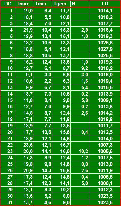 ( T = temperatuur in °C, N = neerslag in mm, LD = luchtdruk in hPa ).