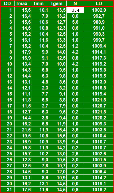( T = temperatuur in °C, N = neerslag in mm, LD = luchtdruk in hPa ).