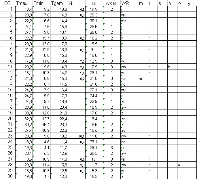 ( T = temperatuur in °C, N = neerslag in mm, LD = luchtdruk in hPa + 1000, WK = windkracht in Beaufort, WR = windrichting, m = mist, r = regen, s = sneeuw, h = hagel, o = onweer en y = ijzel ).