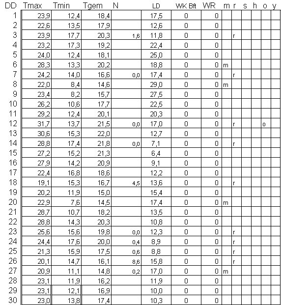 ( T = temperatuur in °C, N = neerslag in mm, LD = luchtdruk in hPa +1000 , WK = windkracht in Beaufort, WR = windrichting, m = mist, r = regen, s = sneeuw, h = hagel, o = onweer en y = ijzel ).