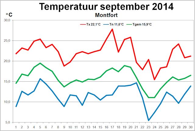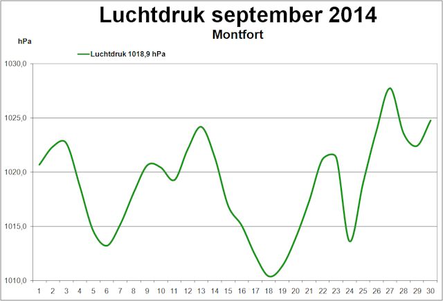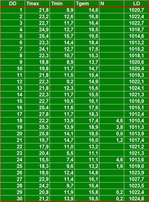 ( T = temperatuur in °C, N = neerslag in mm, LD = luchtdruk in hPa ).