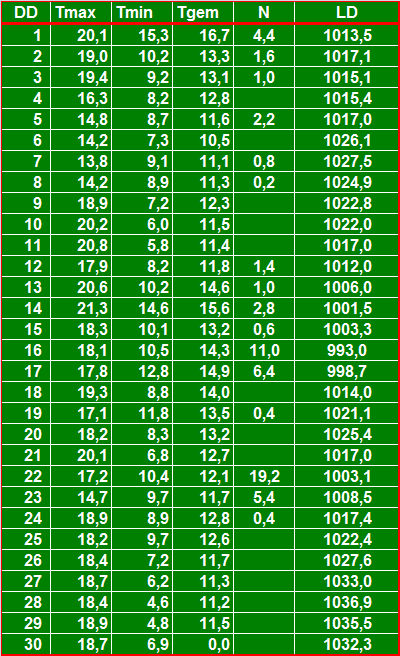 ( T = temperatuur in °C, N = neerslag in mm, LD = luchtdruk in hPa ).