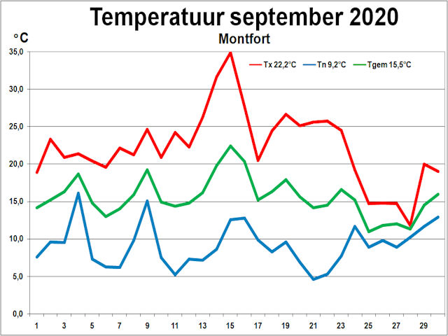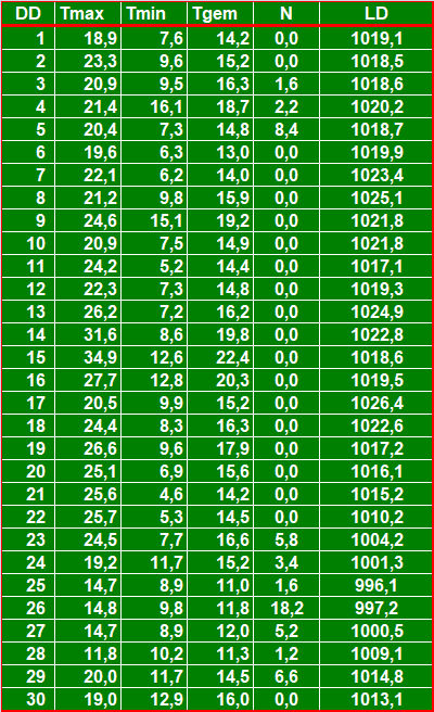 ( T = maximum- minimum- en 24-uursgemiddelde temperatuur in °C, N = neerslag in mm, LD = gemiddelde luchtdruk in hPa ).