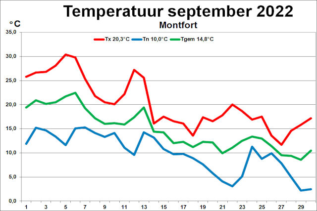 ( T = maximum- minimum- en 24-uursgemiddelde temperatuur in °C, N = neerslag in mm, LD = gemiddelde luchtdruk in hPa ).
