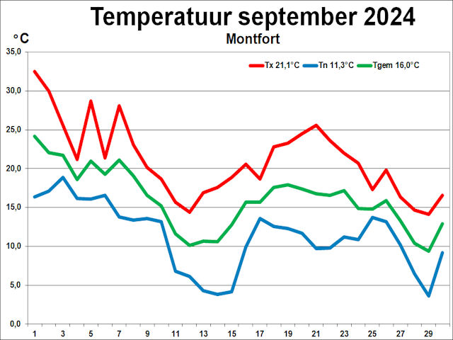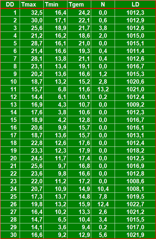 ( T = maximum- minimum- en 24-uursgemiddelde temperatuur in °C, N = neerslag in mm, LD = gemiddelde luchtdruk in hPa ).