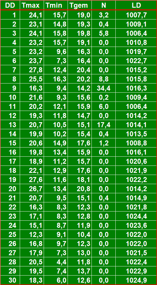 ( T = maximum- minimum- en 24-uursgemiddelde temperatuur in °C, N = neerslag in mm, LD = gemiddelde luchtdruk in hPa ).