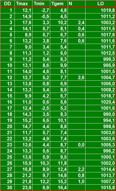 ( T = temperatuur in °C, N = neerslag in mm, LD = luchtdruk in hPa