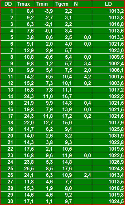 ( T = temperatuur in °C, N = neerslag in mm, LD = luchtdruk in hPa