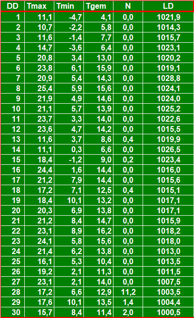 ( T = temperatuur in °C, N = neerslag in mm, LD = luchtdruk in hPa
