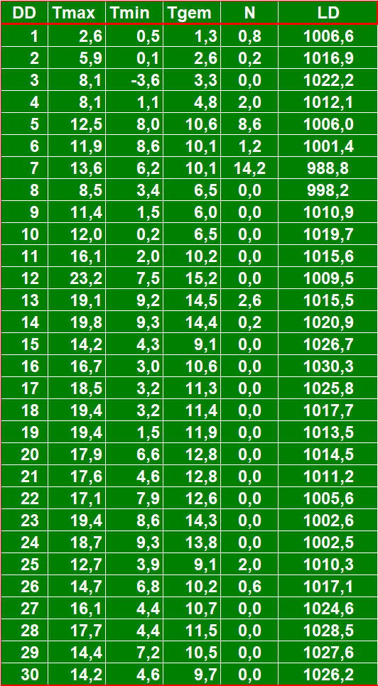 ( T = temperatuur in °C, N = neerslag in mm, LD = luchtdruk in hPa
