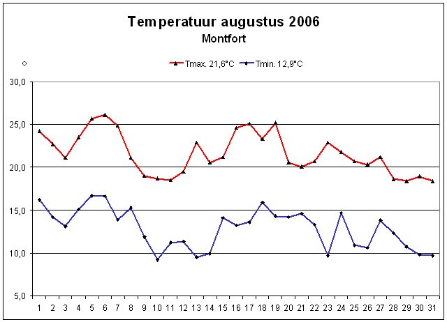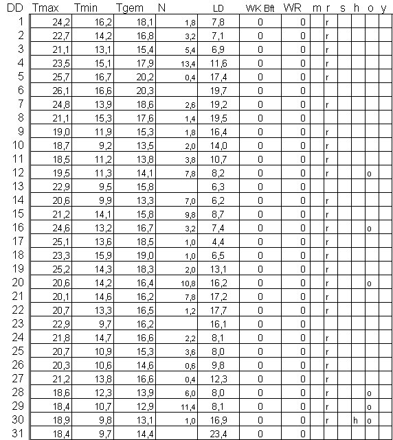 ( T = temperatuur in °C, N = neerslag in mm, LD = luchtdruk in hPa +1000 , WK = windkracht in Beaufort, WR = windrichting, m = mist, r = regen, s = sneeuw, h = hagel, o = onweer en y = ijzel ).