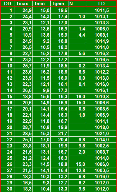 ( T = maximum- minimum- en 24-uursgemiddelde temperatuur in °C, N = neerslag in mm, LD = gemiddelde luchtdruk in hPa ).