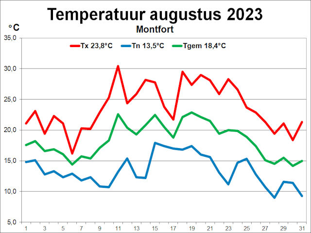 ( T = maximum- minimum- en 24-uursgemiddelde temperatuur in °C, N = neerslag in mm, LD = gemiddelde luchtdruk in hPa ).