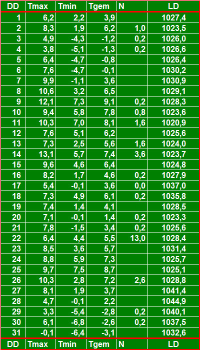 ( T = temperatuur in °C, N = neerslag in mm, LD = luchtdruk in hPa ).