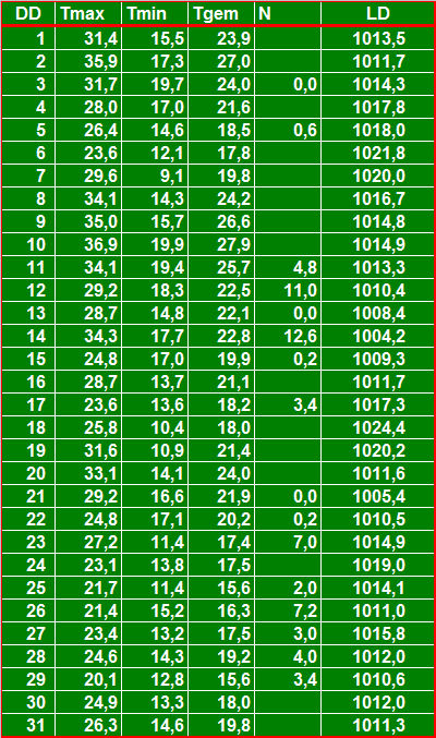 ( T = temperatuur in °C, N = neerslag in mm, LD = luchtdruk in hPa