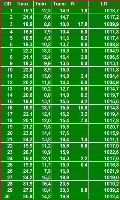 ( T = temperatuur in °C, N = neerslag in mm, LD = luchtdruk in hPa