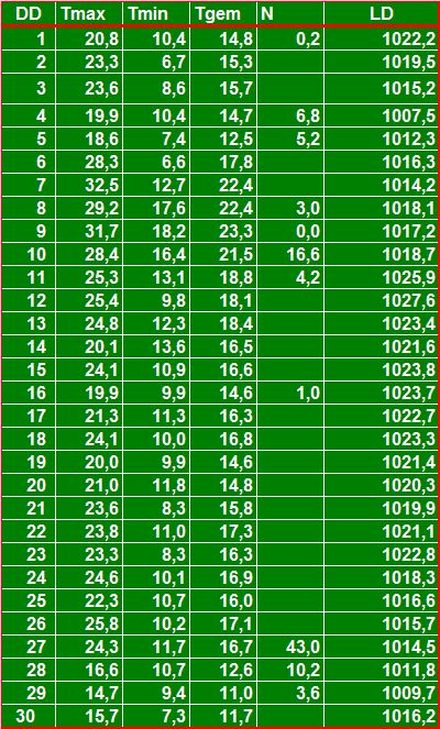 ( T = temperatuur in °C, N = neerslag in mm, LD = luchtdruk in hPa