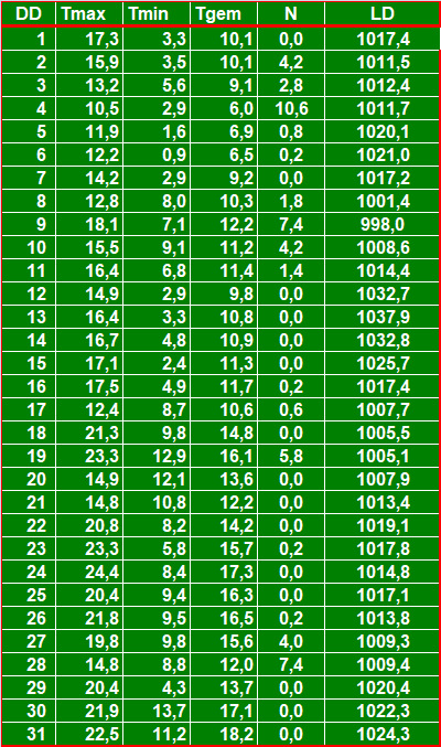 ( T = temperatuur in °C, N = neerslag in mm, LD = luchtdruk in hPa