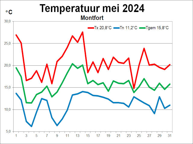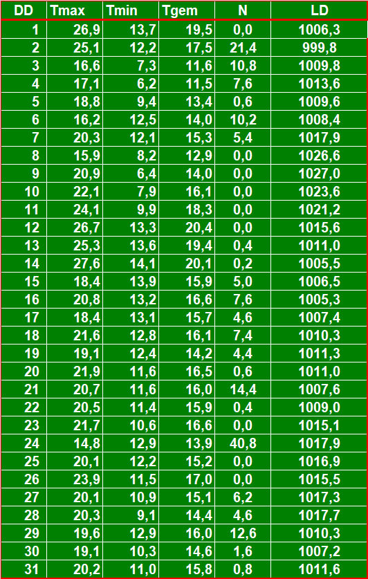 ( T = temperatuur in °C, N = neerslag in mm, LD = luchtdruk in hPa
