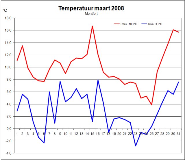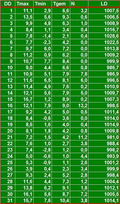 ( T = temperatuur in °C, N = neerslag in mm, LD = luchtdruk in hPa