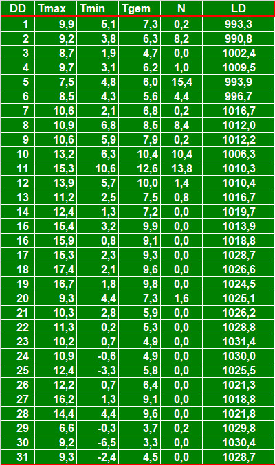 ( T = temperatuur in °C, N = neerslag in mm, LD = luchtdruk in hPa