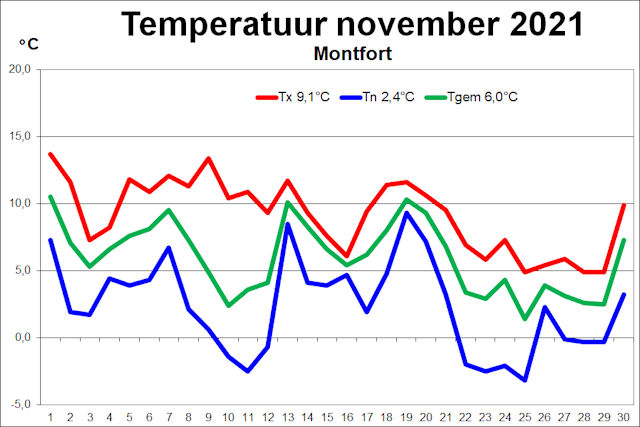 ( T = temperatuur in °C, N = neerslag in mm, LD = luchtdruk in hPa ).