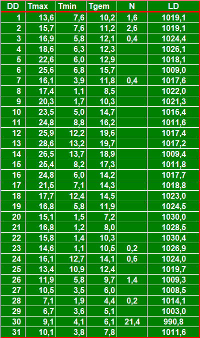 ( T = temperatuur in °C, N = neerslag in mm, LD = luchtdruk in hPa ).