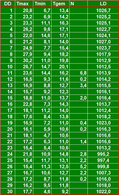 ( T = temperatuur in °C, N = neerslag in mm, LD = luchtdruk in hPa ).