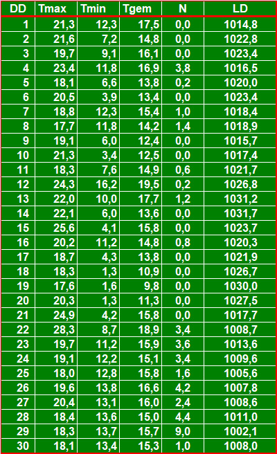 ( T = maximum- minimum- en 24-uursgemiddelde temperatuur in °C, N = neerslag in mm, LD = gemiddelde luchtdruk in hPa ).