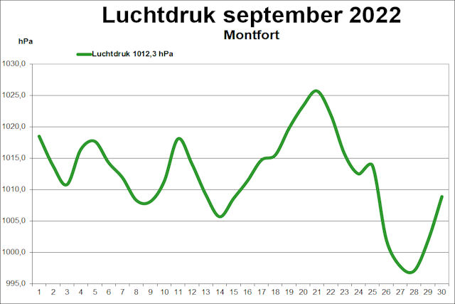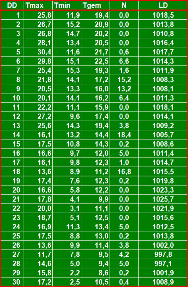 ( T = maximum- minimum- en 24-uursgemiddelde temperatuur in °C, N = neerslag in mm, LD = gemiddelde luchtdruk in hPa ).