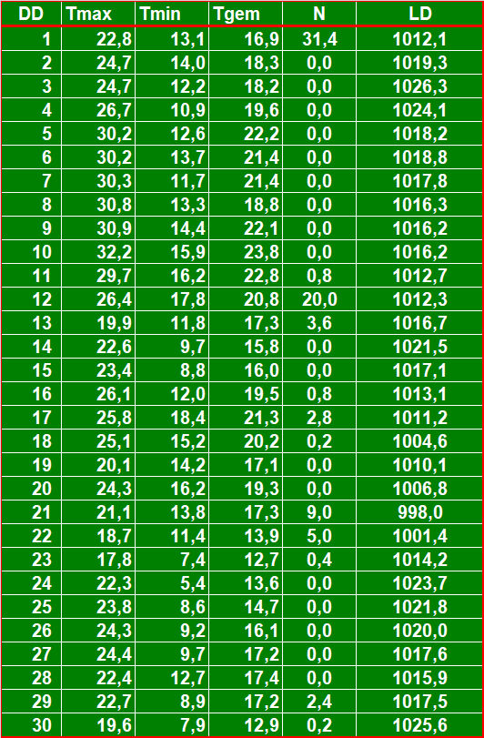 ( T = maximum- minimum- en 24-uursgemiddelde temperatuur in °C, N = neerslag in mm, LD = gemiddelde luchtdruk in hPa ).